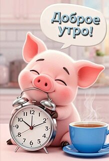 Милая и позитивная открытка с изображением розового поросенка, который с улыбкой обнимает будильник. На переднем плане стоит чашка дымящегося кофе, создающая атмосферу уютного утра. В верхней части картинки расположено текстовое облако с надписью «Доброе утро!». Изображение наполнено теплом, радостью и бодростью, идеально подходит для отправки друзьям, близким и коллегам, чтобы пожелать им прекрасного начала дня и хорошего настроения. Тяжело просыпаться по утрам? Эта добрая картинка поможет зарядиться позитивом!