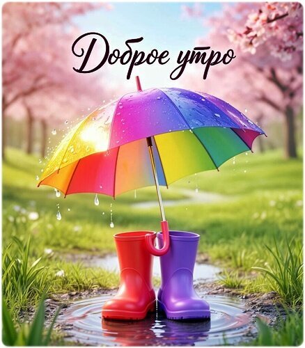 Красочное и позитивное изображение для пожелания доброго утра. На фоне цветущей сакуры или розовых деревьев в весеннем парке стоит яркий радужный зонт, из-под которого выглядывают два резиновых сапога — красный и фиолетовый. Зонт и сапоги стоят в небольшой луже, отражающей свет. На картинке видна капельная влага, создающая ощущение свежести после дождя. В верхней части расположена элегантная надпись на русском языке «Доброе утро». Идеально подходит для отправки в мессенджерах и социальных сетях для создания праздничного и радостного настроения.