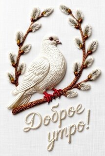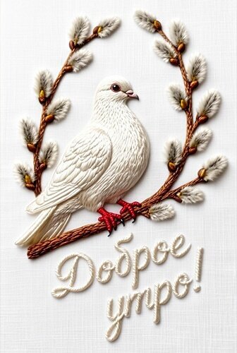 Доброе утро! На открытке белый голубь сидит на веточке вербы.