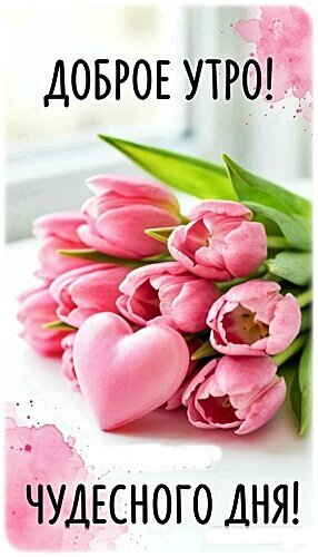 Красивая поздравительная открытка с букетом нежно-розовых тюльпанов. На изображении крупным шрифтом написано «ДОБРОЕ УТРО! ЧУДЕСНОГО ДНЯ!». Декор выполнен в акварельном стиле с розовыми пятнами, создающими романтичное и светлое настроение. В центре композиции также присутствует розовое сердце. Идеально подходит для отправки близким, друзьям и любимым в качестве утреннего пожелания хорошего дня.