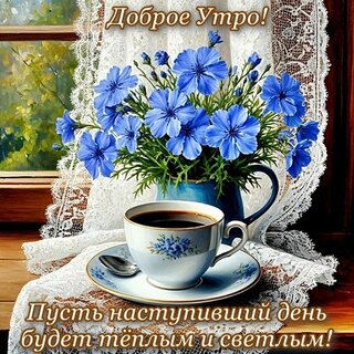 Красивая открытка с пожеланием доброго утра. На изображении представлен уютный натюрморт: чашка ароматного кофе на блюдце с цветочным узором и букет ярко-синих цветов цикория в голубой кружке. Композиция расположена у окна с кружевной занавеской, создавая атмосферу тепла и спокойствия. Внизу расположена надпись на русском языке: «Пусть наступивший день будет тёплым и светлым!». Идеально подходит для отправки друзьям и близким в мессенджерах и социальных сетях для создания хорошего настроения с самого утра.