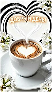 Эстетичная поздравительная открытка с чашкой горячего кофе, украшенной латте-артом в форме сердца. Из чашки поднимается легкий пар, создавая уютную атмосферу. Композиция дополнена нежными белыми цветами вишни или яблони и стильным черно-белым фоном в форме сердца. В верхней части расположена надпись «ДОБРЫЙ ДЕНЬ!». Идеальное изображение для пожеланий хорошего дня, создания весеннего настроения и передачи тепла в мессенджерах и социальных сетях.