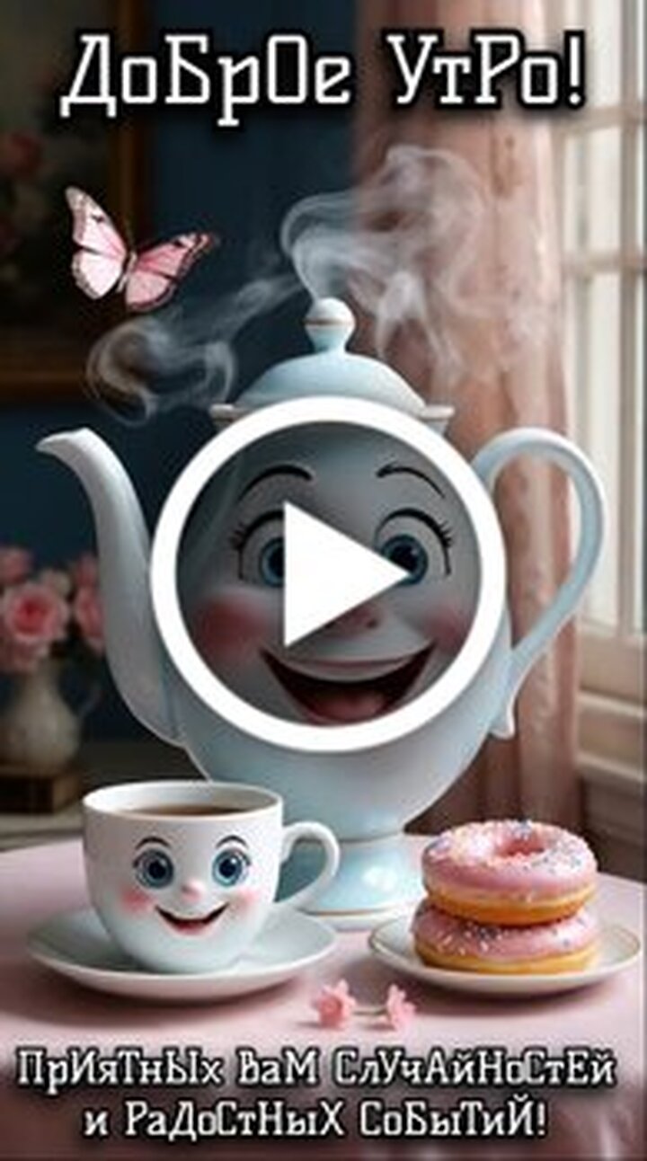 Красивое и позитивное видео для доброго утра. На экране оживают милые антропоморфные персонажи: светлый чайник и чашка с очаровательными лицами. Сюжет представляет собой уютную сцену чаепития, где из чайника наливается напиток, а вокруг летают яркие бабочки. Композиция дополнена аппетитным розовым пончиком и нежными цветами, создавая атмосферу радости и уюта. Это видео наполнено пожеланиями приятных случаев и радостных событий для хорошего начала дня.