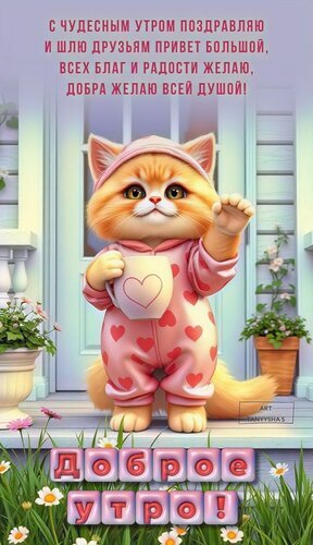 Милая поздравительная открытка с изображением очаровательного рыжего котенка в розовом комбинезоне в сердечках. Котенок держит кружку с сердцем и приветливо машет лапкой. На фоне — светлая терраса с цветами в горшках. Сверху расположен праздничный текст на русском языке с пожеланиями добра и радости, а внизу крупная надпись «Доброе утро!». Идеально подходит для отправки друзьям и близким в мессенджерах и социальных сетях для создания позитивного настроения с самого утра.