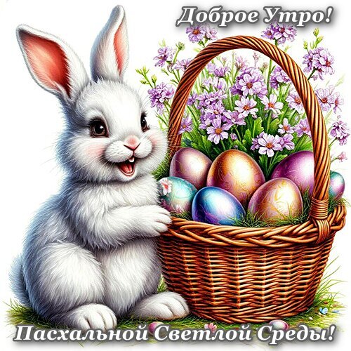 Красочная праздничная открытка к Пасхе с изображением милого пушистого белого кролика. Рядом с кроликом стоит плетеная корзина, наполненная яркими раскрашенными пасхальными яйцами и нежными фиолетовыми цветами. На картинке расположены поздравительные надписи на русском языке: «Доброе Утро!» сверху и «Пасхальной Светлой Среды!» снизу. Изображение выполнено в ярком, сказочном стиле, идеально подходит для передачи весеннего настроения и пасхального поздравления близким и друзьям.