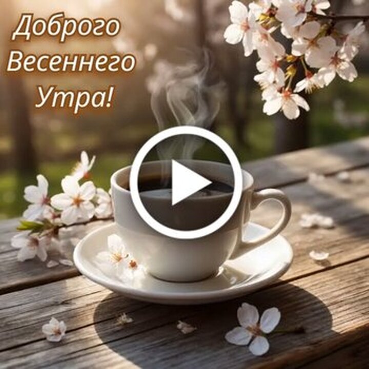 Красивое и атмосферное видео для пожелания доброго весеннего утра. На кадре изображена чашка горячего ароматного кофе, от которой поднимается легкий пар. Чашка стоит на деревянном столе в окружении нежных цветущих ветвей сакуры или вишни. Солнечный свет мягко освещает композицию, создавая ощущение тепла, уюта и начала нового прекрасного дня. Это идеальное видео для создания весеннего настроения и отправки близким в качестве приятного приветствия.