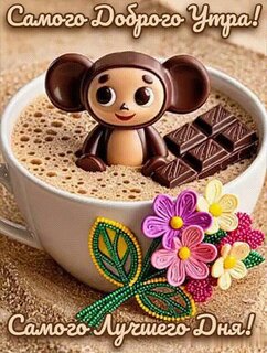 Милая поздравительная открытка для доброго утра. На изображении запечатлена чашка ароматного кофе с пышной пенкой, в которой сидит забавный шоколадный чебурашка. Рядом с персонажем лежат кусочки темного шоколада. Чашка украшена ярким декором из розовых и желтых цветов с зелеными листьями. На картинке расположены надписи на русском языке: «Самого доброго утра!» сверху и «Самого лучшего дня!» снизу. Изображение наполнено уютом, теплом и позитивным настроением, идеально подходит для отправки друзьям и близким в мессенджерах или социальных сетях для поднятия настроения с самого утра.