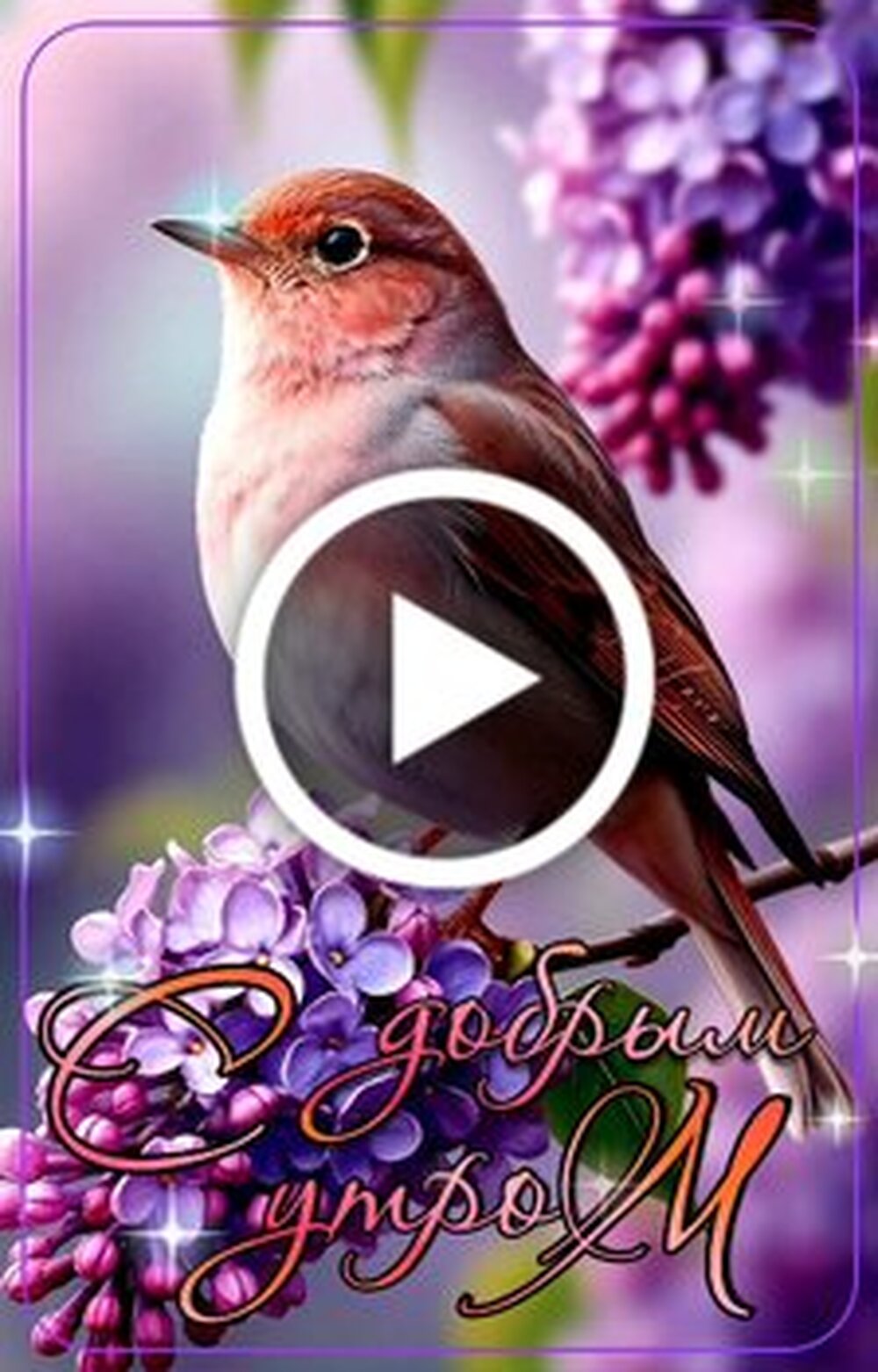 Красивое и нежное видео для доброго утра. На видео запечатлена маленькая певчая птица с мягким оперением, которая изящно сидит на ветке цветущей сирени. Насыщенные фиолетовые оттенки цветов создают атмосферу весеннего уюта и спокойствия. Кадр дополнен мерцающими искрами света и надписью "С добрым утром". Это видео идеально подходит для того чтобы отправить пожелание хорошего дня близким людям и создать позитивное настроение с самого начала дня.