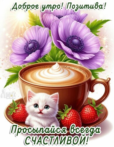 Теги:доброе утро, позитива, пожелания нак аждый день, просыпайся всегда счастливой, котенок, милота, кофе, клубника, красивая картинка, цветы, анемоны