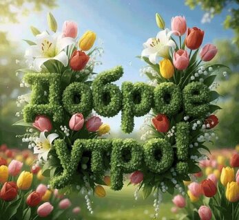 Красивая поздравительная открытка с надписью «Доброе утро!» на русском языке. Текст выполнен в виде объемного зеленого мха или травы. Композиция украшена пышными букетами из разноцветных тюльпанов (розовых, желтых, красных) и белоснежных лилий на фоне солнечного весеннего сада. Изображение наполнено свежестью, яркими цветами и солнечным светом, создавая позитивное и вдохновляющее настроение для утреннего приветствия.