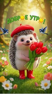 Милая и яркая поздравительная открытка с надписью «Доброе утро!». На картинке изображен очаровательный мультяшный ежик в красном берете и резиновых сапожках, который держит букет красных тюльпанов. Ежик стоит на цветущем лугу под солнечными лучами, а вокруг него летают маленькие птички. Изображение наполнено теплом, уютом и позитивным настроением, идеально подходит для отправки друзьям и близким в качестве утреннего пожелания.