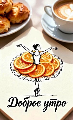 Художественная иллюстрация балерины с юбкой из долек сочного апельсина на светлом фоне. Композиция дополнена чашкой кофе с латте-артом и свежей выпечкой, создавая уютную утреннюю атмосферу. В нижней части изображения стильная надпись на русском языке «Доброе утро». Идеальное изображение для пожеланий доброго утра, вдохновения и эстетичного настроения.