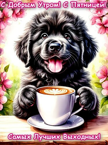 Милая и яркая открытка с изображением пушистого черного щенка, который держит в лапах чашку горячего кофе с латте-артом в виде сердечка. Фон украшен нежными розовыми цветами сакуры или вишни, создающими весеннее и уютное настроение. Сверху на картинке красуется надпись на русском языке «С Добрым Утром! С Пятницей!», а снизу — пожелание «Самых Лучших Выходных!». Идеально подходит для отправки друзьям и близким в мессенджерах и социальных сетях для создания позитивного настроения в пятницу утром.