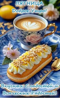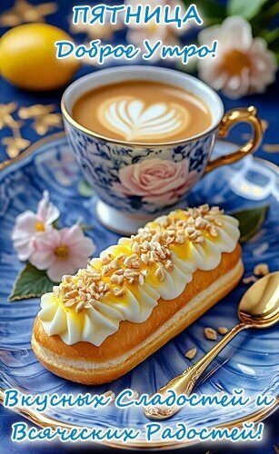 Эстетичное изображение для пожелания доброго утра в пятницу. На композиции представлена чашка ароматного капучино с латте-артом в цветочном фарфоре и аппетитный эклер с кремом и орехами на изысканной синей тарелке. Атмосферная картинка с надписью «Пятница. Доброе утро! Вкусных сладостей и всяческих радостей!», идеально подходящая для отправки друзьям и близким в мессенджерах и социальных сетях для создания праздничного настроения.