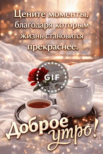 Уютная и вдохновляющая картинка для пожелания доброго утра. На изображении представлена композиция на светлой постели: белая чайная пара с ароматным чаем, изящный белый чайник и одна ярко-красная роза в вазе. Теплый солнечный свет и мягкие блики создают атмосферу спокойствия и нежности. На картинке размещена красивая цитата на русском языке: " Цените моменты, благодаря которым жизнь становится прекраснее" и приветствие" Доброе утро!". Идеально подходит для отправки близким, друзьям и в социальные сети для создания позитивного настроения с самого утра.