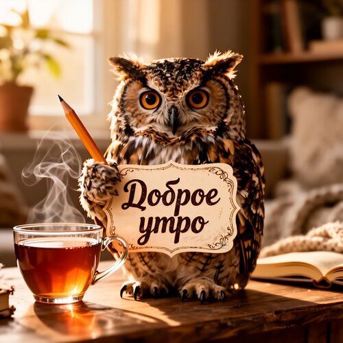 Уютная и вдохновляющая иллюстрация с изображением мудрой совы, которая держит табличку с надписью «Доброе утро» на русском языке. Сова сидит за деревянным столом рядом с чашкой дымящегося горячего чая и открытой книгой. Мягкое утреннее освещение создает теплую, домашнюю атмосферу. Идеально подходит для использования в качестве утреннего приветствия, поздравительной открытки или стокового изображения для создания позитивного настроения и мотивации на новый день.