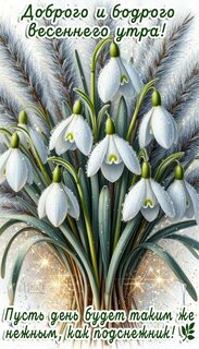 Красочная поздравительная открытка с изображением нежных белых подснежников, покрытых капельками росы, на фоне пушистых колосьев. На картинке размещен вдохновляющий текст на русском языке: «Доброго и бодрого весеннего утра! Пусть день будет таким же нежным, как подснежник!». Идеально подходит для отправки друзьям и близким в качестве утреннего пожелания весеннего настроения и тепла.
