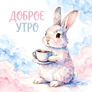 Милая акварельная иллюстрация с пушистым белым кроликом, который держит чашку горячего кофе. Изображение выполнено в нежных пастельных тонах с использованием мягких голубых и розовых оттенков, напоминающих облака. На картинке красуется вдохновляющая надпись на русском языке «Доброе утро». Идеально подходит для использования в качестве открытки, поздравительного поста в социальных сетях, сторис или декоративного элемента для создания уютного утреннего настроения.