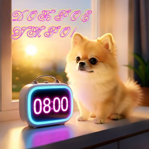 Уютное и теплое изображение с милым рыжим померанским шпицем, сидящим на подоконнике рядом с цифровым будильником. На часах отображается время 08: 00. Мягкий утренний свет из окна создает атмосферу доброго начала дня. Сверху на картинке расположена надпись на русском языке «Доброе УТРО!», выполненная в розовом неоновом стиле. Идеально подходит для пожеланий доброго утра, создания позитивного настроения и использования в социальных сетях.