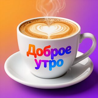 Яркая и уютная картинка с чашкой горячего кофе в белой керамической чашке на блюдце. На молочной пенке кофе выгравировано нежное сердце в технике латте-арт. Над чашкой поднимается легкий пар, создавая ощущение тепла. На переднем плане на самой чашке расположена надпись «Доброе утро» в разноцветном градиенте. Фон выполнен в мягких переходах оранжевого, розового и фиолетового цветов, создавая позитивное и вдохновляющее настроение. Идеально подходит для поздравительных открыток и утренних пожеланий в социальных сетях.