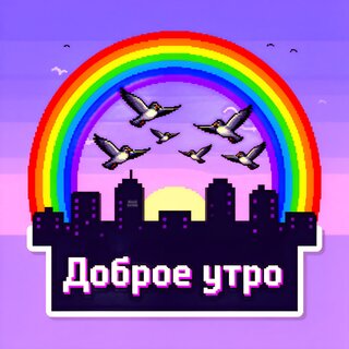 Пиксельная иллюстрация в стиле ретро-гейминга, изображающая яркую радугу над силуэтом ночного города на фоне заката. В небе летят птицы, создавая атмосферу спокойствия и утреннего пробуждения. В нижней части изображения расположена стилизованная надпись «Доброе утро» крупным шрифтом. Изображение выполнено в насыщенных фиолетовых, синих и радужных тонах, идеально подходящих для открыток, поздравительных постов в соцсетях и тематических обоев в стиле pixel art.
