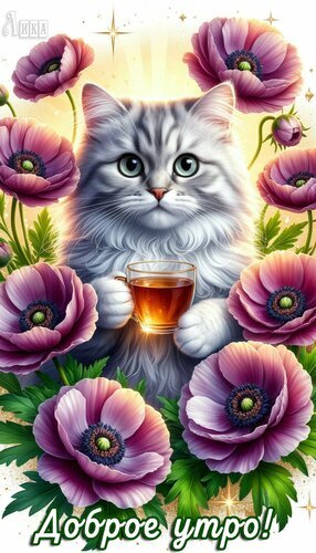 Милая и уютная цифровая иллюстрация с пушистым серым котиком, который держит чашку горячего чая. Котик окружен пышными розово-фиолетовыми цветами анемонами на светлом фоне с мягкими солнечными лучами. В нижней части изображения стильная надпись на русском языке «Доброе утро!». Идеально подходит для открыток, пожеланий доброго утра в мессенджерах и создания позитивного настроения.