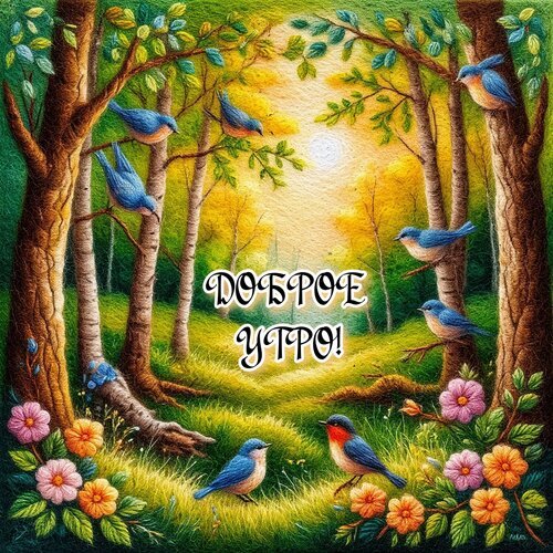 Живописная и уютная открытка с изображением солнечного леса, наполненного маленькими синими птицами. На фоне золотистого утреннего солнца и зелени деревьев красуются нежные розовые и оранжевые цветы. В центре композиции расположена стильная надпись на русском языке «Доброе утро!», создающая позитивное и вдохновляющее настроение. Идеально подходит для отправки друзьям и близким в качестве доброго пожелания начала дня.