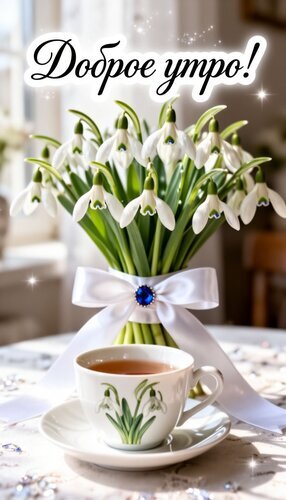 Красивая и нежная поздравительная открытка с надписью «Доброе утро!». На изображении представлен пышный букет белоснежных подснежников, перевязанный изящной белой атласной лентой с синим камнем. На переднем плане стоит чашка ароматного чая на блюдце, украшенная принтом с подснежниками. Композиция наполнена солнечным светом, весенним настроением и уютом, что делает её идеальной для отправки близким в качестве утреннего пожелания.