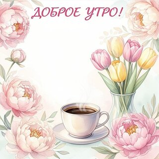 Красивая открытка с надписью «Доброе утро!» в нежных пастельных тонах. Композиция украшена пышными розовыми пионами и букетом желтых и розовых тюльпанов в вазе. В центре внимания — чашка ароматного черного кофе на блюдце, от которой исходит легкий пар. Идеальное изображение для пожелания доброго утра, создания уютного настроения и отправки близким в мессенджерах или социальных сетях. Элегантный цветочный дизайн, весеннее настроение и эстетика кофе.