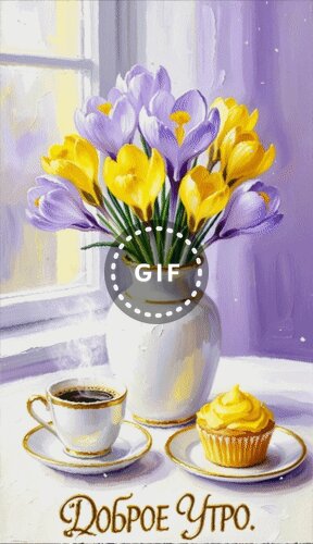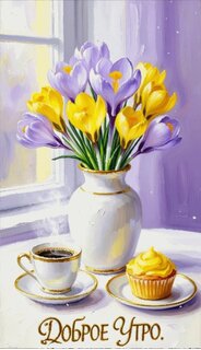 Живописное изображение букета весенних крокусов желтого и фиолетового цвета в белой вазе, стоящей на подоконнике. Рядом расположена чашка горячего кофе и аппетитный капкейк на блюдцах. На переднем плане надпись золотистым шрифтом «Доброе утро». Атмосферная и уютная картина, передающая нежность утреннего света и весеннее настроение, идеально подходит для поздравительных открыток и пожеланий хорошего дня.