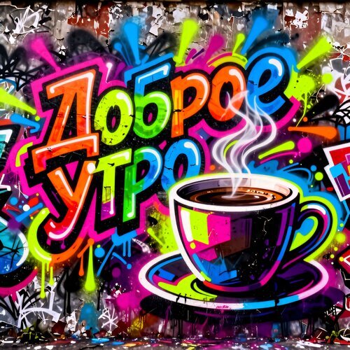 Яркая и энергичная цифровая иллюстрация в стиле граффити, посвященная хорошему утру. На фоне взрывных брызг краски, неоновых цветов и динамичных уличных шрифтов изображена чашка дымящегося ароматного кофе. Насыщенные оттенки розового, голубого, зеленого и оранжевого создают позитивное и бодрящее настроение. Идеально подходит для использования в качестве приветственной открытки, стокового изображения для социальных сетей или вдохновляющего фона.
