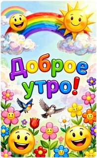 Яркая и позитивная праздничная открытка с пожеланием «Доброго утра!». Изображение наполнено радостью: улыбающееся солнце, разноцветная радуга, пушистые облака и летящие птицы. Композицию украшают милые цветы и веселые смайлики. Идеально подходит для отправки друзьям и близким в мессенджерах (WhatsApp, Viber) или социальных сетях, чтобы поднять настроение с самого утра. Декоративная картинка с текстом для создания позитивного настроя на весь день.