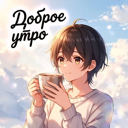 Аниме-иллюстрация в нежных пастельных тонах, изображающая милого молодого человека с чашкой горячего кофе или чая на фоне светлого утреннего неба с мягкими облаками. На картинке присутствует стильная надпись на русском языке «Доброе утро», создающая уютную и позитивную атмосферу. Изображение идеально подходит для использования в качестве утреннего приветствия в социальных сетях, сторис или в качестве эстетичных обоев для телефона. Высокое качество прорисовки персонажа и мягкое освещение передают ощущение спокойствия и начала нового дня.