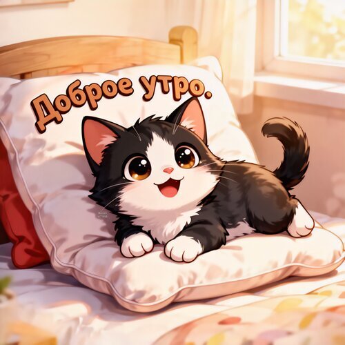 Милая и уютная цифровая иллюстрация с изображением маленького черно-белого котенка, лежащего на мягкой белой подушке. Котенок нарисован в стиле аниме с большими выразительными глазами и радостной улыбкой, что создает атмосферу тепла и счастья. На картинке присутствует надпись на русском языке «Доброе утро», выполненная объемным шрифтом. Солнечный свет из окна мягко освещает сцену, создавая идеальный визуальный контент для пожеланий доброго утра в социальных сетях, мессенджерах или в качестве обоев для рабочего стола. Изображение наполнено позитивом, нежностью и домашним уютом.