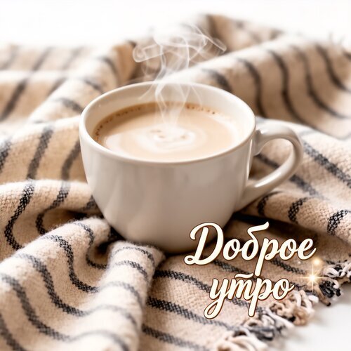 Уютное и атмосферное изображение горячего кофе с молоком в белой керамической чашке. От напитка поднимается легкий пар, создавая ощущение тепла и комфорта. Чашка расположена на мягком полосатом пледе в светлых бежевых и коричневых тонах. На переднем плане стильная надпись на русском языке «Доброе утро», выполненная каллиграфическим шрифтом с золотистым свечением. Идеально подходит для тематических постов о завтраке, утре, уюте и эстетике спокойного начала дня.