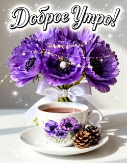 Красивая поздравительная открытка с надписью «Доброе утро!». На изображении представлен роскошный букет фиолетовых анемонов, перевязанный белой атласной лентой с жемчужной брошью. На переднем плане стоит чашка ароматного чая с цветочным принтом, дополненная декоративной сосновой шишкой. Композиция наполнена нежностью, мерцающими искрами и утренним светом, идеально подходящая для отправки близким, друзьям или коллегам в качестве пожелания прекрасного начала дня.