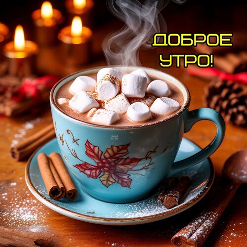 Уютное и теплое изображение для пожелания доброго утра: чашка горячего шоколада с пышными маршмэллоу, украшенная корицей, на фоне зажженных свечей и зимнего декора. Атмосфера праздника, тепла и домашнего уюта. Идеально подходит для сторис, открыток и постов в социальных сетях для создания настроения.