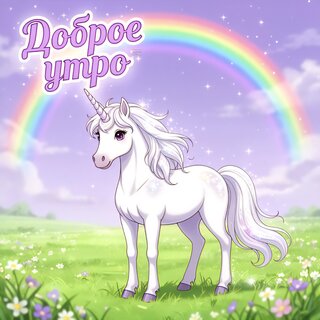 Милая и сказочная иллюстрация с единорогом на фоне радуги и нежно-фиолетового неба. Белый единорог с длинной гривой стоит на зеленом лугу среди цветов. В верхней части изображения стильная надпись на русском языке «Доброе утро». Картинка наполнена волшебной атмосферой, блестками и мягким светом, идеально подходит для пожеланий доброго утра, открыток и вдохновляющего контента в социальных сетях.