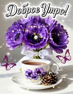 Красивая праздничная открытка с надписью «Доброе утро!». На изображении представлен роскошный букет ярко-фиолетовых анемонов, украшенных сверкающей нитью жемчуга. Рядом стоит изящная чашка чая или кофе с цветочным принтом, стоящая на блюдце рядом с сосновой шишкой. Композицию дополняют летящие фиолетовые бабочки и мягкое мерцание блесток на светлом фоне, создавая уютную и вдохновляющую атмосферу для начала дня.