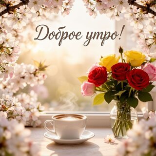 Красивая открытка с пожеланием доброго утра. На нежном фоне цветущих вишневых или яблоневых ветвей изображен букет из красных и желтых роз в вазе и чашка ароматного кофе на подоконнике. Солнечный свет пробивается сквозь цветы, создавая уютную и теплую весеннюю атмосферу. Идеально подходит для отправки близким, друзьям и любимым для создания хорошего настроения с самого утра.