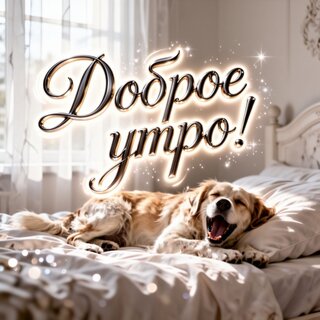 Уютная и теплая открытка с надписью «Доброе утро!» на фоне милого золотистого ретривера, сладко спящего в кровати. Изображение наполнено солнечным светом, нежными бликами и атмосферой спокойствия. Идеально подходит для пожелания доброго утра в социальных сетях, мессенджерах и качестве вдохновляющей картинки для начала дня.