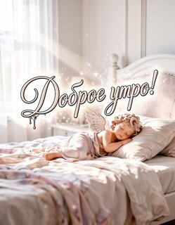 Эстетичное и нежное изображение для пожелания доброго утра. На картинке запечатлен маленький ангел с крыльями, мирно спящий на мягкой светлой постели в лучах утреннего солнца. Атмосфера наполнена уютом, спокойствием и светом. В центре композиции красивая каллиграфическая надпись на русском языке «Доброе утро!». Идеально подходит для использования в качестве открытки в социальных сетях, мессенджерах (WhatsApp, Telegram) или для создания вдохновляющего контента для сторис.