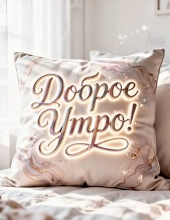 Декоративная интерьерная подушка с надписью «Доброе утро!» в элегантном каллиграфическом стиле. Подушка выполнена в нежных бежевых и пудровых тонах с эффектом мраморного узора и золотистыми искрами. Надпись имитирует мягкое неоновое свечение, создавая уютную и теплую атмосферу в спальне или гостиной. Идеальный подарок для создания позитивного настроения с самого утра. Стильный аксессуар для современного интерьера в стиле сканди, минимализм или бохо.