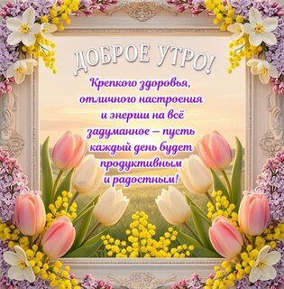 Красивая праздничная открытка с пожеланиями доброго утра. На изображении представлен изысканный классический багет, украшенный нежными розовыми тюльпанами, веточками мимозы и цветущей сиренью. На фоне мягкого рассветного неба нанесен текст на русском языке: «Доброе утро! Крепкого здоровья, отличного настроения и энергии на всё задуманное – пусть каждый день будет продуктивным и радостным!». Идеально подходит для отправки в мессенджерах и социальных сетях для создания позитивного настроения близким и друзьям.