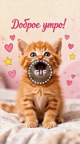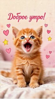Милое изображение рыжего котенка с открытым ртом, словно он зевает или радостно мяукает. Картинка украшена розовыми сердечками и желтыми звездами на нежном светлом фоне. Сверху добавлена надпись на русском языке «Доброе утро!». Идеально подходит для отправки в мессенджерах и социальных сетях в качестве поздравительной открытки, чтобы поднять настроение близким и друзьям с самого утра.