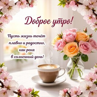 Красивая поздравительная открытка с пожеланием доброго утра. На изображении представлен уютный натюрморт: чашка кофе с нежной пенкой и букет нежных розовых и персиковых роз в стеклянной вазе. Композицию обрамляют весенние цветущие ветви сакуры или вишни. На фоне виден светлый интерьер с мягким солнечным светом. По центру расположена вдохновляющая надпись на русском языке: " Доброе утро! Пусть жизнь течёт плавно и радостно, как река в солнечный день!". Идеально подходит для отправки близким в мессенджерах и социальных сетях для создания позитивного настроения с самого утра.