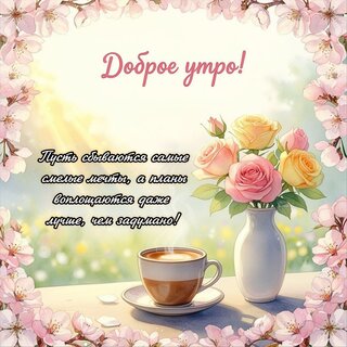 Красивая открытка с пожеланием доброго утра. На изображении представлен уютный натюрморт: чашка ароматного кофе с паром, ваза с нежными розовыми и желтыми розами на светлом фоне. Композиция обрамлена веточками цветущей сакуры или вишни. Поверх изображения надпись на русском языке: «Доброе утро! Пусть сбываются самые смелые мечты, а планы воплощаются даже лучше, чем задумано!» Идеально подходит для отправки в мессенджерах и соцсетях для создания позитивного настроения.