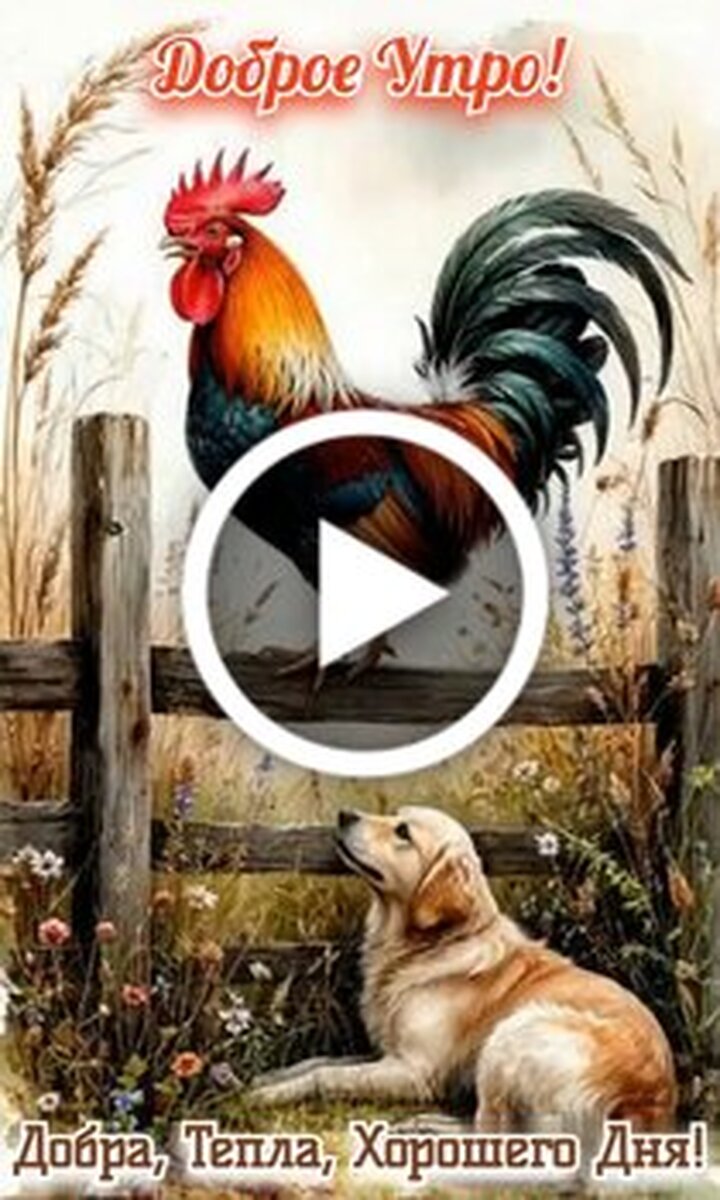 Красивое поздравительное видео для доброго утра. На живописном фоне деревенского пейзажа с деревянным забором и полевыми цветами изображен яркий петух, сидящий на ограде, и преданный золотистый пес, смотрящий вверх. Видео наполнено уютом и теплотой сельской природы. Текстовые надписи на русском языке желают доброго утра, добра, тепла и хорошего дня. Это идеальный ролик для отправки близким и друзьям, чтобы подарить им позитивное настроение с самого начала дня.