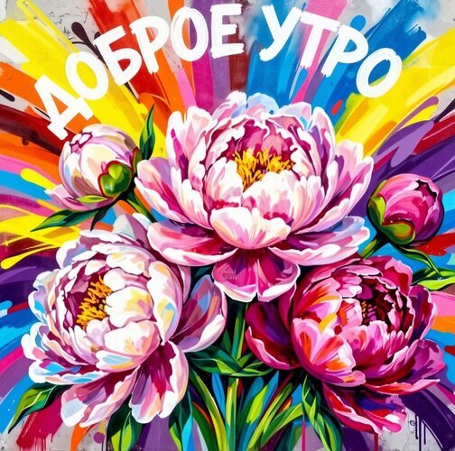 Яркая и эмоциональная картина в стиле экспрессионизма с изображением пышных розовых пионов. На фоне цветущих цветов крупными белыми буквами написано «Доброе утро». Картина выполнена в насыщенной цветовой гамме с использованием динамичных мазков желтого, синего, красного и фиолетового цветов, создающих эффект солнечных лучей. Идеально подходит для создания позитивного настроения, в качестве открытки или декоративного элемента интерьера. Подойдет для поиска по запросам: живопись цветами, открытка доброе утро, яркие пионы арт, экспрессивная флористика.