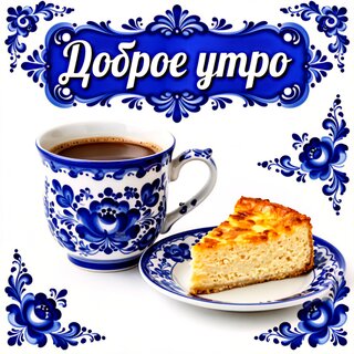 Уютная и эстетичная открытка с надписью «Доброе утро» в стилистике Гжель. На изображении представлена чашка горячего кофе в традиционной сине-белой росписи и аппетитный кусочек домашнего сырника или чизкейка на тарелке. Декор выполнен в виде изящных синих цветочных узоров на белом фоне, создавая атмосферу тепла, комфорта и приятного начала дня. Идеально подходит для поздравления близких и друзей в социальных сетях.